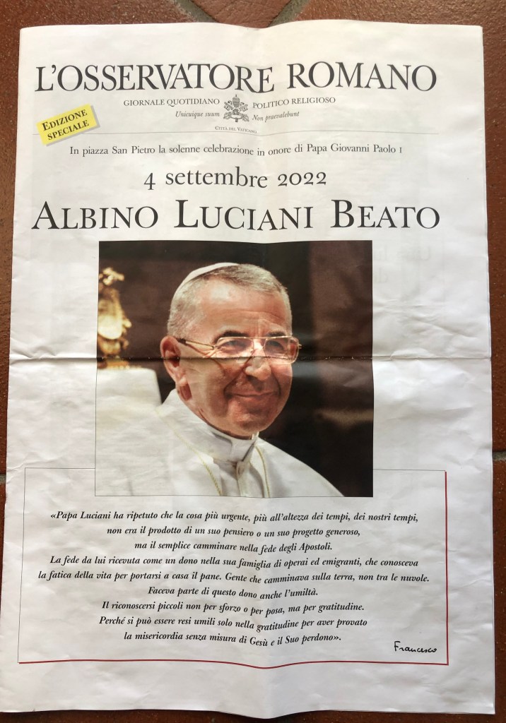 We are invited by the Prefecture of the Papal Household to attend the ceremony and papal mass in Rome for the beatification of Papa Luciani, John Paul I, on Sunday, 4 September 2022.