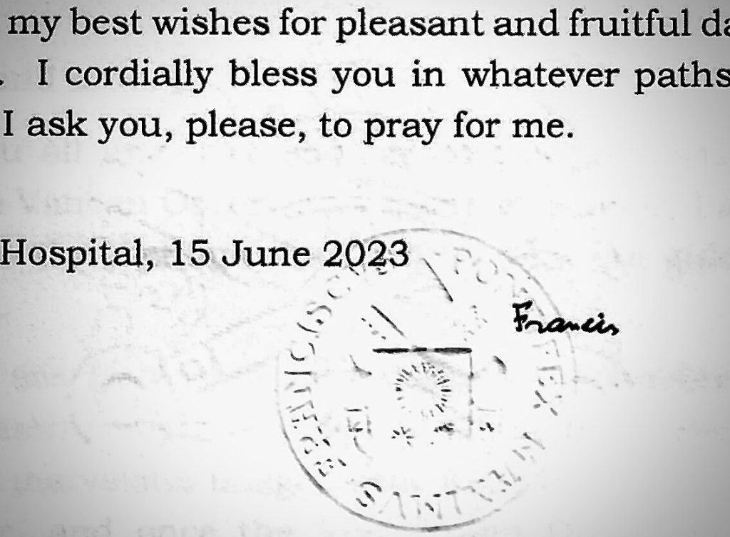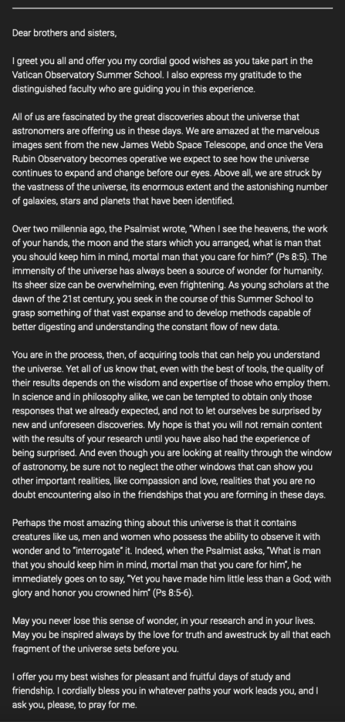 Unfortunately, the Papal Audience with the Vatican Observatory 2023 Summer School had to be canceled while the Pope was in the hospital recovering from surgery. However, from his hospital bed, he sent the following message: